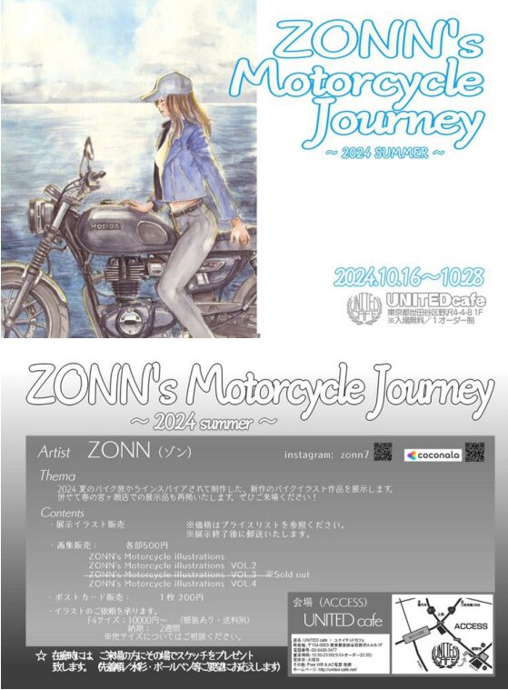 株式会社ユナイテッド・アーツは、イラストレーターZONN 氏による展示会「ZONN’s Motorcycle Journey」および、デザイナー飯村武志 氏による展示会「MOTO ENTHUSIAST」を開催すると発表した。