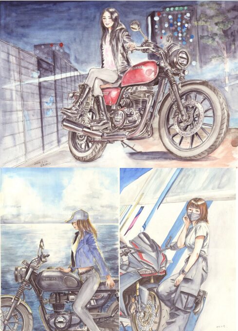 バイク+旅をテーマとした水彩バイクイラストを展示します。