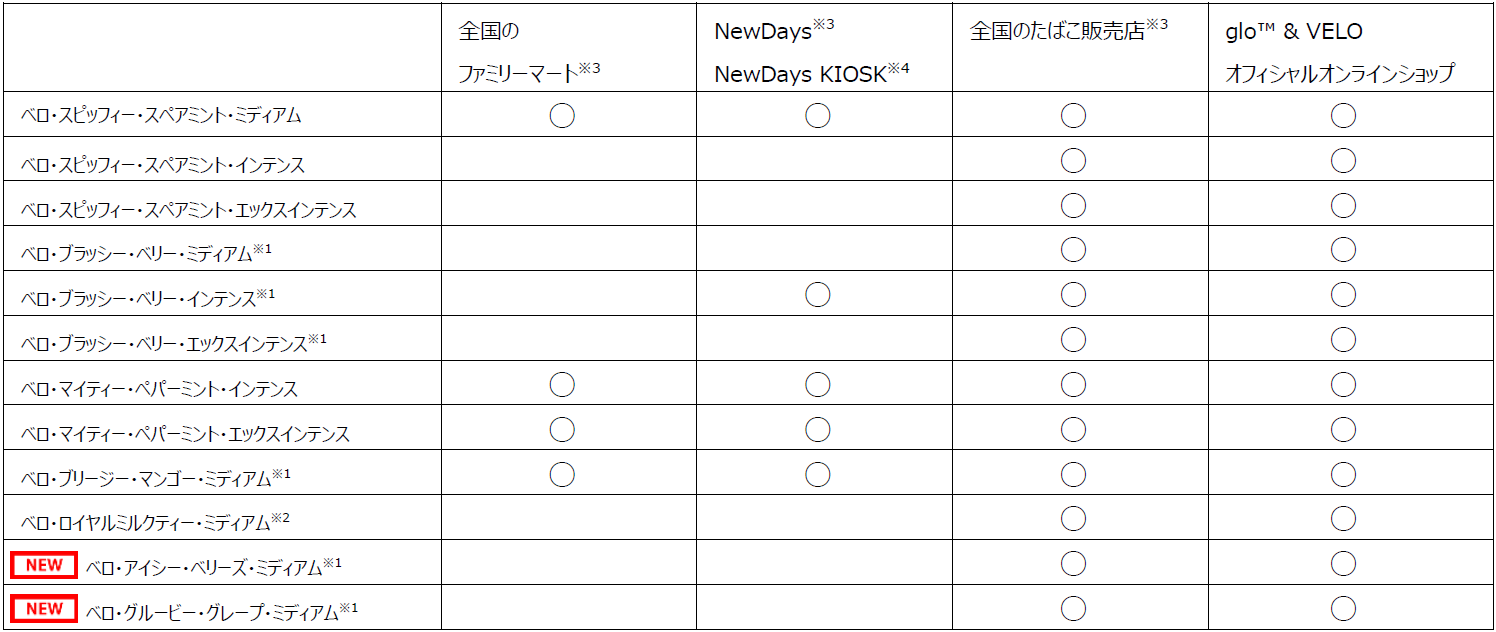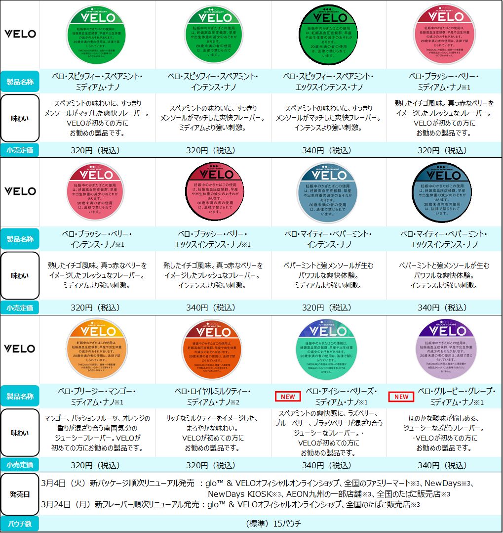 同製品は、これまでファミリーマートでの販売は東京都内および福岡市内に限られていたが、今後は全国のファミリーマートでも購入できるようになる。また、これに伴い販売中の同製品の全ラインナップのパッケージデザインを刷新したうえ、新たに「ベロ・アイシー・ベリーズ・ミディアム」と「ベロ・グルービー・グレープ・ミディアム」の2つのベリー系フレーバーを、3月24日(月)よりglo™ & VELOオフィシャルオンラインショップおよび全国のたばこ販売店にて発売する。