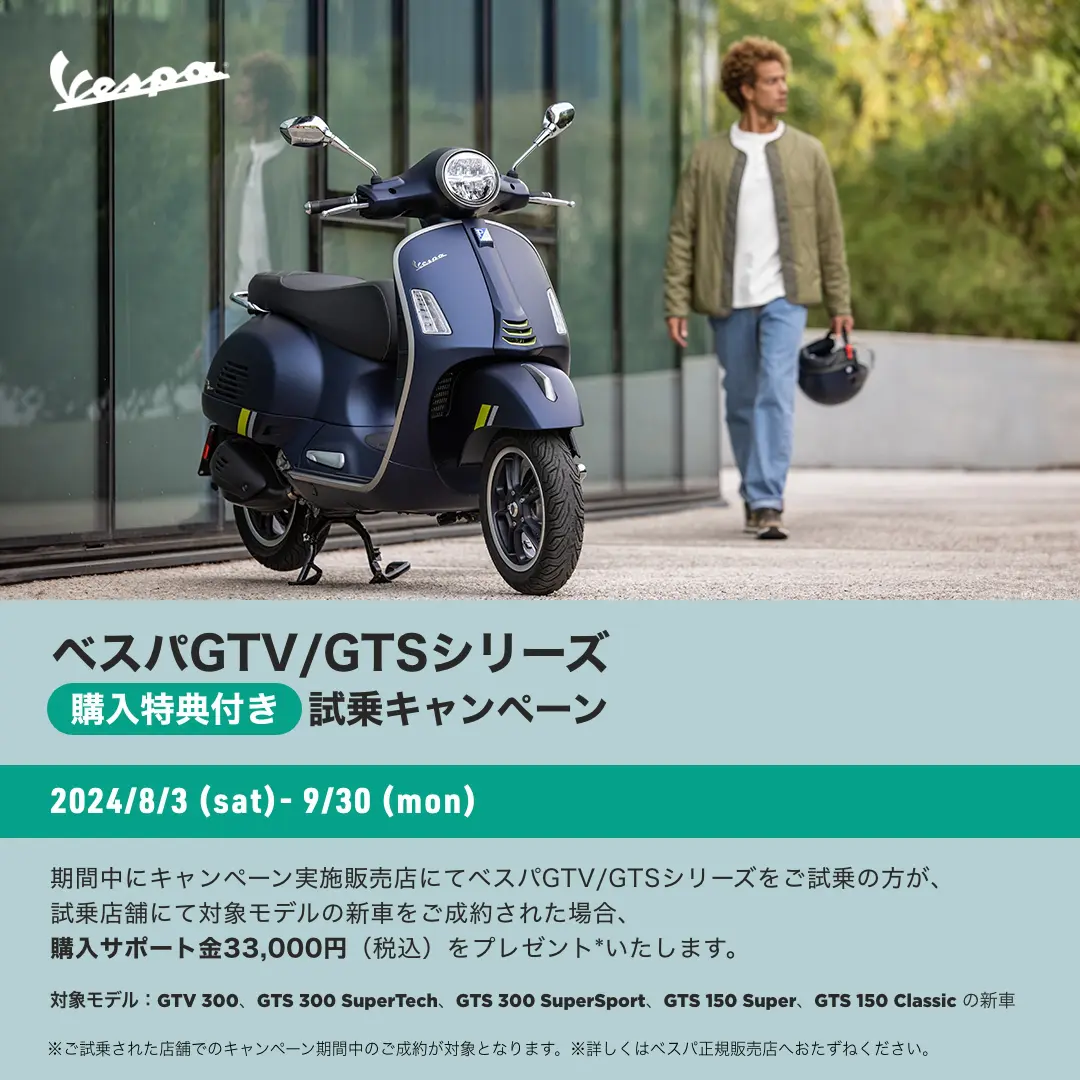キャンペーン内容 : 期間中にキャンペーン実施販売店にてベスパ GTV/GTS シリーズをご試乗の方が、期間中に試乗店舗にて対象モデルの新車をご成約された場合、購入サポート金 33,000 円(税込)をプレゼント※いたします。