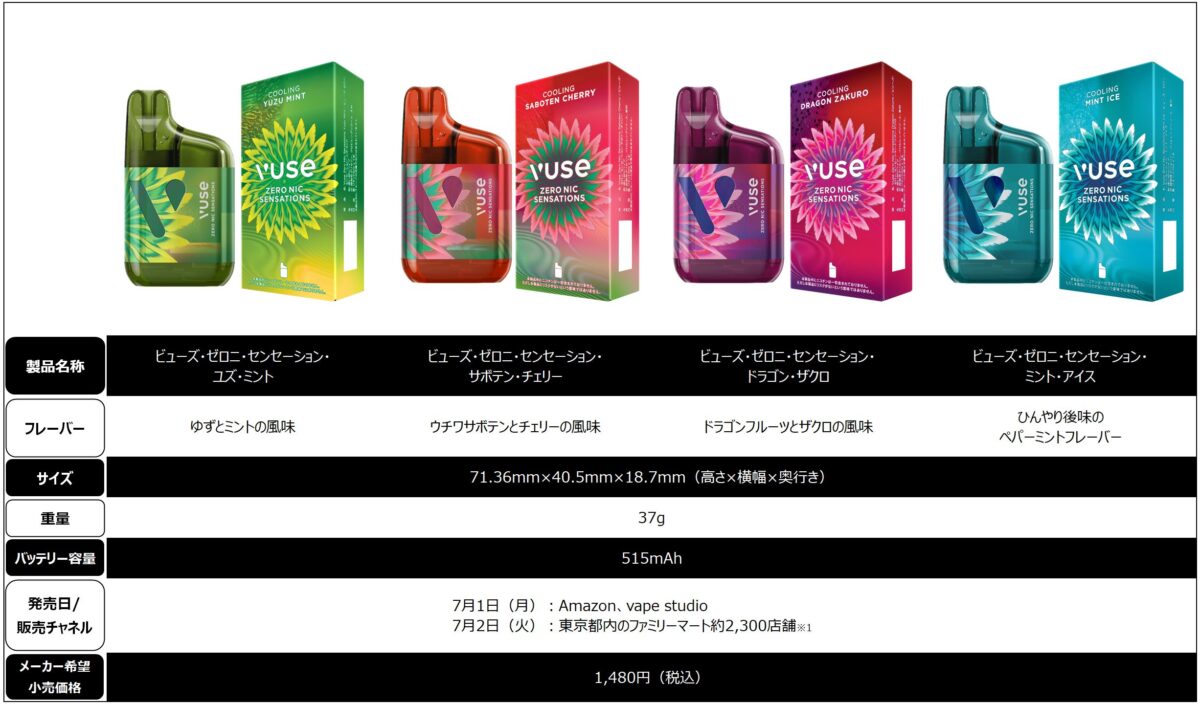 ブリティッシュ・アメリカン・タバコ・ジャパン合同会社は、ベイプブランド「Vuse(ビューズ)」から、デザインを一新し、ゼロニコチンながらも満足感のある味わいを実現したゼロニコチンベイプ製品の新モデル「ビューズ・ゼロニ・センセーション」4銘柄を、2024年7月1日(月)より順次、世界初展開すると発表した。