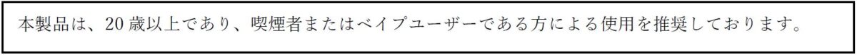 BAT グループでは、たばこ製品のマーケティングを適切に実施するために国際的な自主規準を設定しています。そのためベイプ製品に関しても、弊社としては、責任あるマーケティング活動の精神に則り、本製品は20歳以上であり、喫煙者またはベイプユーザーである方による使用を推奨しております。記事掲載していただく際には、「注意文言」が表示されるようご配慮いただきたく存じます。 ご協力の程、何卒よ