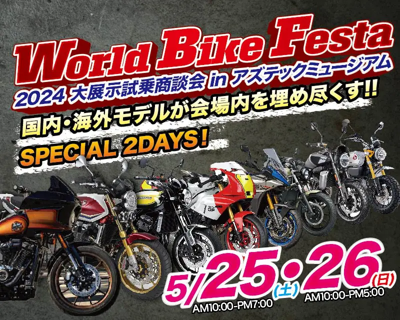 オートバイ・自転車を販売および修理する「ハヤサカサイクル」を運営する株式会社早坂サイクル商会(本社:宮城県仙台市、代表取締役:早坂 武)は宮城県仙台市太白区にあるイベントホール アズテックミュージアムにて、東北最大級のバイクイベント「World Bike Festa」を2024年5月25日(土曜)、26日(日曜)に開催します。