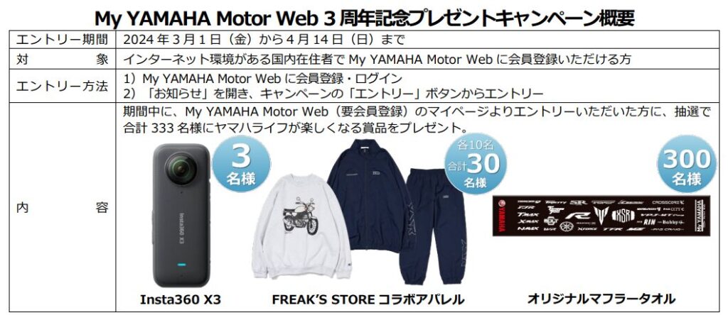 同キャンペーンは、「My YAMAHA Motor Web」に会員登録し、同キャンペーンにエントリーしたユーザー向けに、抽選で3名にポケットサイズの360度アクションカメラ「Insta360 X3」、30名に「FREAK‘S STOREとのコラボアパレル」、300名に「オリジナルマフラータオル」が当たるヤマハファン必見のキャンペーンとなる。エントリー期間は2024年3月1日から4月14日までだ。