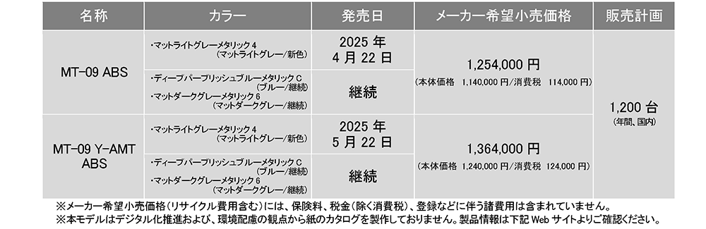 ヤマハ発動機販売株式会社は、「MT-09 ABS」とクラッチ操作不要の「MT-09 Y-AMT ABS」に、未来的でクリーンな印象の新色“マットライトグレー”を追加し2025年5月22日に発売する。