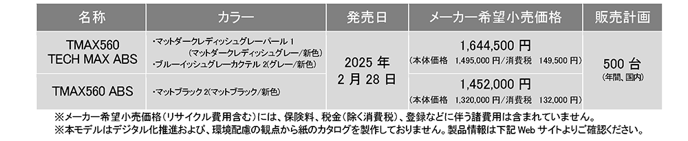 ヤマハ発動機販売株式会社は、総合性能の充実を図ったオートマチックスポーツ「TMAX560 TECH MAX ABS」および「TMAX560 ABS」を2025年2月28日に発売します。
