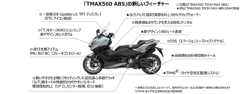 上級モデルの「TMAX560 TECH MAX ABS」には、今回新たに1)ヘアライン仕上げの切削ホイール、2)「TPMSⓇ(Tire Pressure Monitoring System:タイヤ空気圧監視システム)※」、3)温まりやすくなった新グリップウォーマーなどを採用。なお、クルーズコントロールシステム、電動調整式スクリーン、メインシートヒーター、調整機能付きリアサスペンション、ハンドルスイッチバックライト、ワンプッシュスタート等の装備は継続です。