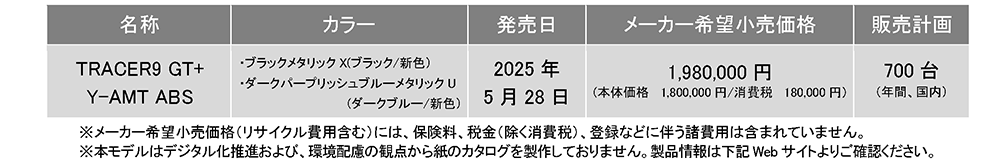 ヤマハ発動機販売株式会社は、スポーツツアラーのフラッグシップモデル「TRACER9 GT+」にライダーをサポートする新機能を搭載した2025年モデルとし「TRACER9 GT+ Y-AMT ABS」へ名称変更して5月28日に発売する。