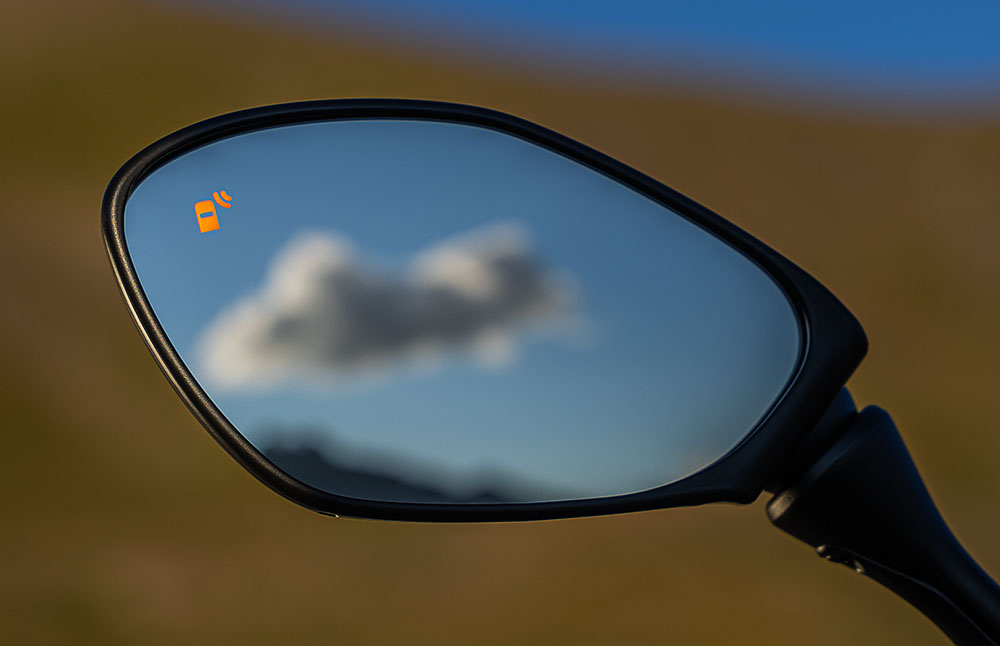 先行車の有無と車間を検知する「ミリ波レーダー」をこれまでの車体前方に加えて、今回新たに車体後方にも追加しました。車体後方から接近してくる、もしくはミラーで視認しづらいエリア(=ブラインドスポット)に位置する車両を検知し、ミラー内にインジケーターを点灯します。自車の周囲の走行状況を可視化する機能ですが、あくまでも運転支援機能であり、ライダー自身が安全確認をすることが前提です。