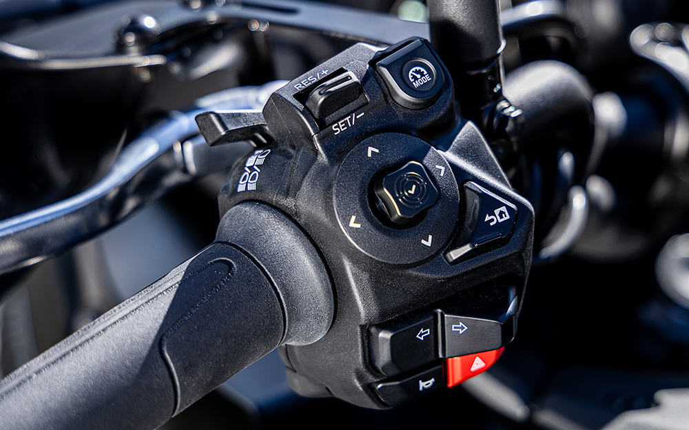ライダーが設定した任意の速度を超過しないよう、エンジン出力を制限します。速度調整をアシストし、スロットル操作の負担を軽減。システムの作動・調整・解除は、クルーズコントロールの操作スイッチを介して行う他、解除は、スロットルを全閉方向へ押し込むことによっても停止できます。