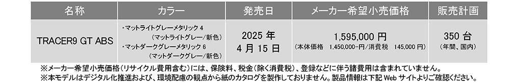 ヤマハ発動機販売株式会社は、高いスポーツ性と実用機能を備えたスポーツツーリングモデル「TRACER9 GT ABS」の装備を充実し、2025年モデルとして2025年4月15日に発売する。