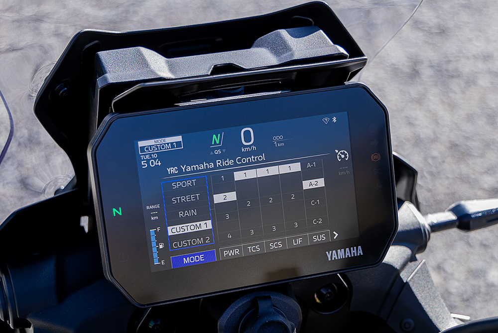 ・走行モード切替は、4種のモードを選べる現行の「D-MODE」から、今回新たに「YRC(Yamaha Ride Control)」へと進化させました。走行フィーリングの選択だけでなく、各種電子制御の介入度も選べるようになりました。プリセットの3種(SPORT/STREET/RAIN)の他、2 種のカスタマイズ枠(CUSTOM1/2)を設けています。