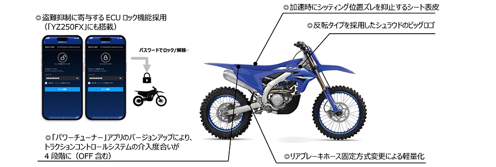 4ストロークの「YZ450FX」と「YZ250FX」には、盗難抑制に寄与するECUロック機能を市販オフロード競技用モデルとして初搭載しました*²。専用アプリ「パワーチューナー」によるエンジンチューニングの容易化は従来からの特徴ですが、今回新たに「パワーチューナー」でロック操作すると、パスワードを入力しなければ、エンジン始動できない仕組みを織り込んでいます。