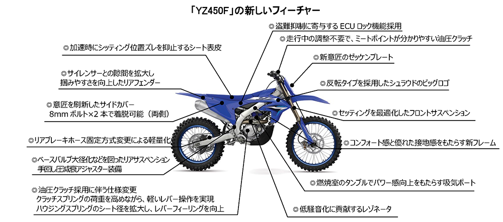 また、YZ450F同様に、盗難抑制に寄与するECUロック機能や、加速時のホールド感を高める新シート表皮を採用しています(70th Anniversary Edition含む)。