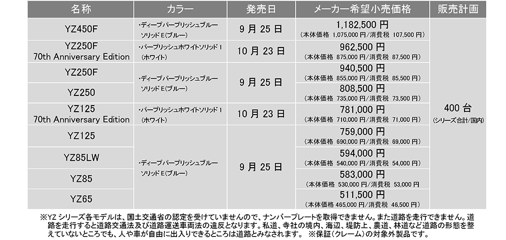 ※1 本製品は「ヤマハオフロードコンペティションモデル正規取扱店」にて、2025年6月25日から12月22日まで(「70th Anniversary Edition」は7月31日まで、YZ250とYZ125は11月30日まで)の期間限定で予約の受付を行います。予約が生産計画を上回る場合は、予約受付期間終了を待たずに受付を終了する場合があります。 ※2 ヤマハ発動機調べ。2025年5月現在。