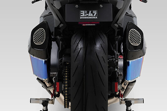 カーボンファイバーと網目状の排気口が特徴的なリアスタイル。ヨシムラロゴが刻まれたヘキサゴナル状のチタン製排気プレートは、レーサー開発からの技術をフィードバックした機構。排気脈動を最適化しリニアなアクセルワークを可能にしています。