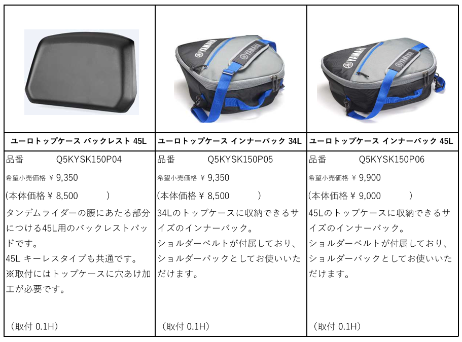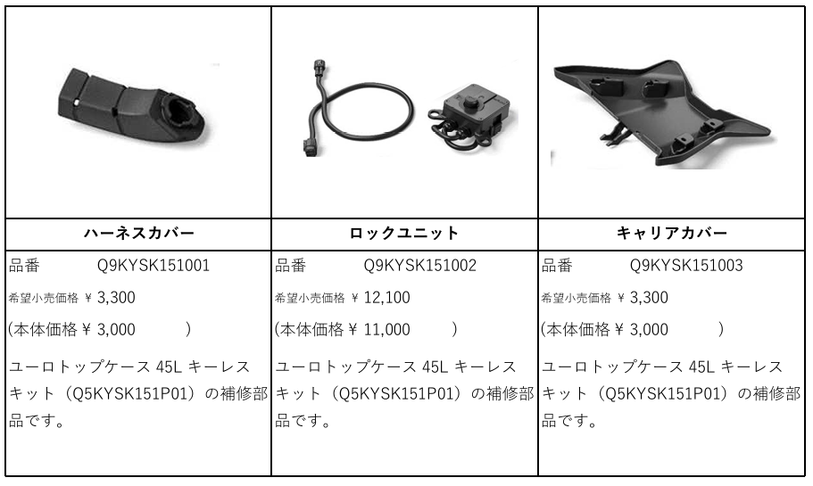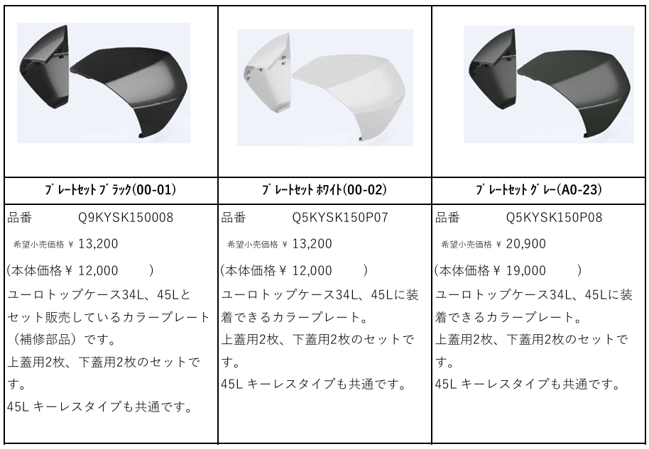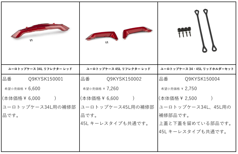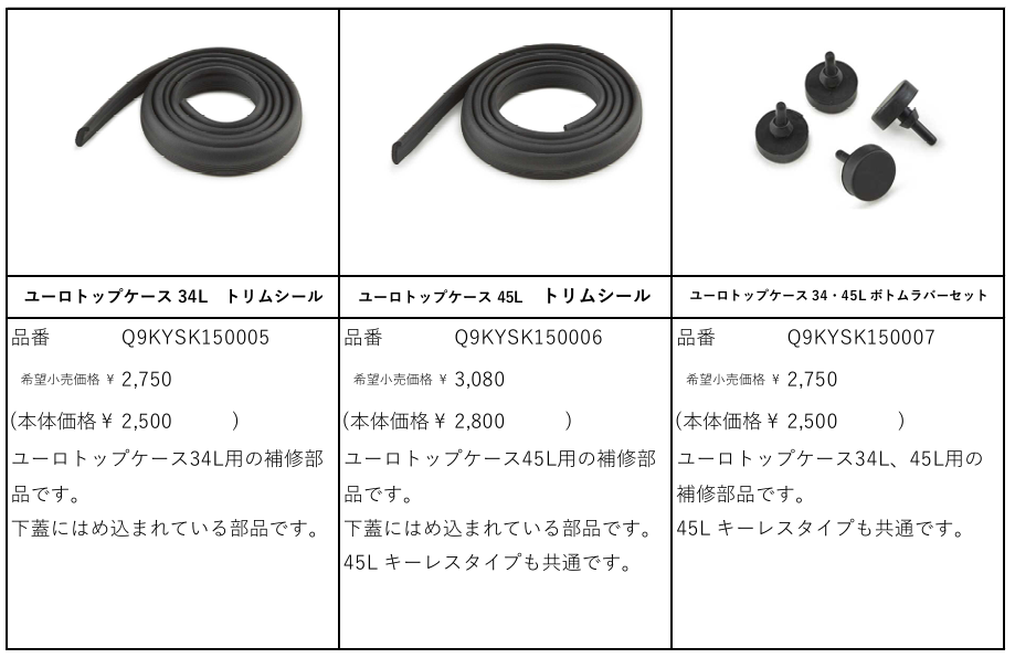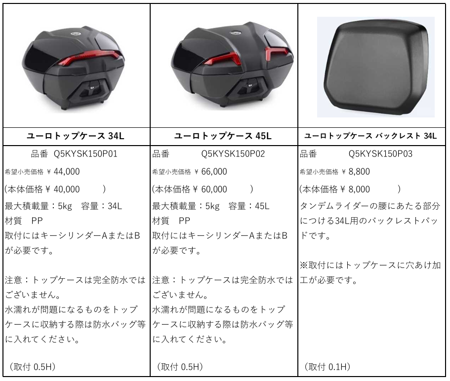 ユニバーサルプレートやリアキャリア、キーシリンダーは従来品が継続して使用でき、ユーロトップケース39Lが適合する車両には34Lが、ユーロトップケース50Lが適合する車両には45Lが使用できます。