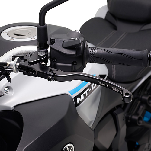 精度の高い切削加工を施し、細かな位置調整機構を備えたMTロゴ刻印入りブラックアルマイト仕上げのレバー。フォールディング(可倒式)機能