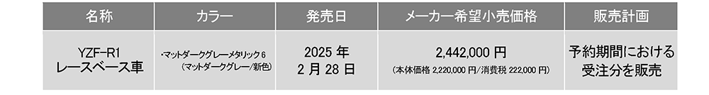 ヤマハ発動機販売株式会社は、ロードレース競技およびサーキット走行専用モデル「YZF-R1 レースベース車(2025年モデル)」を、予約期間限定の受注生産で2025年2月28日に発売します。