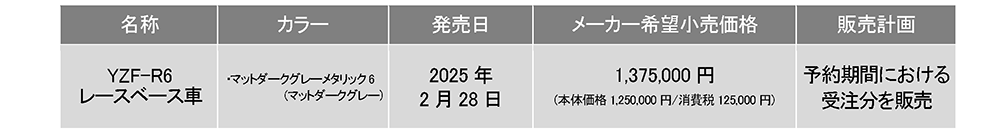 ヤマハ発動機販売株式会社は、ロードレース競技およびサーキット走行専用モデル「YZF-R6 レースベース車(2025年モデル)」を、予約期間限定の受注生産で2025年2月28日に発売します。