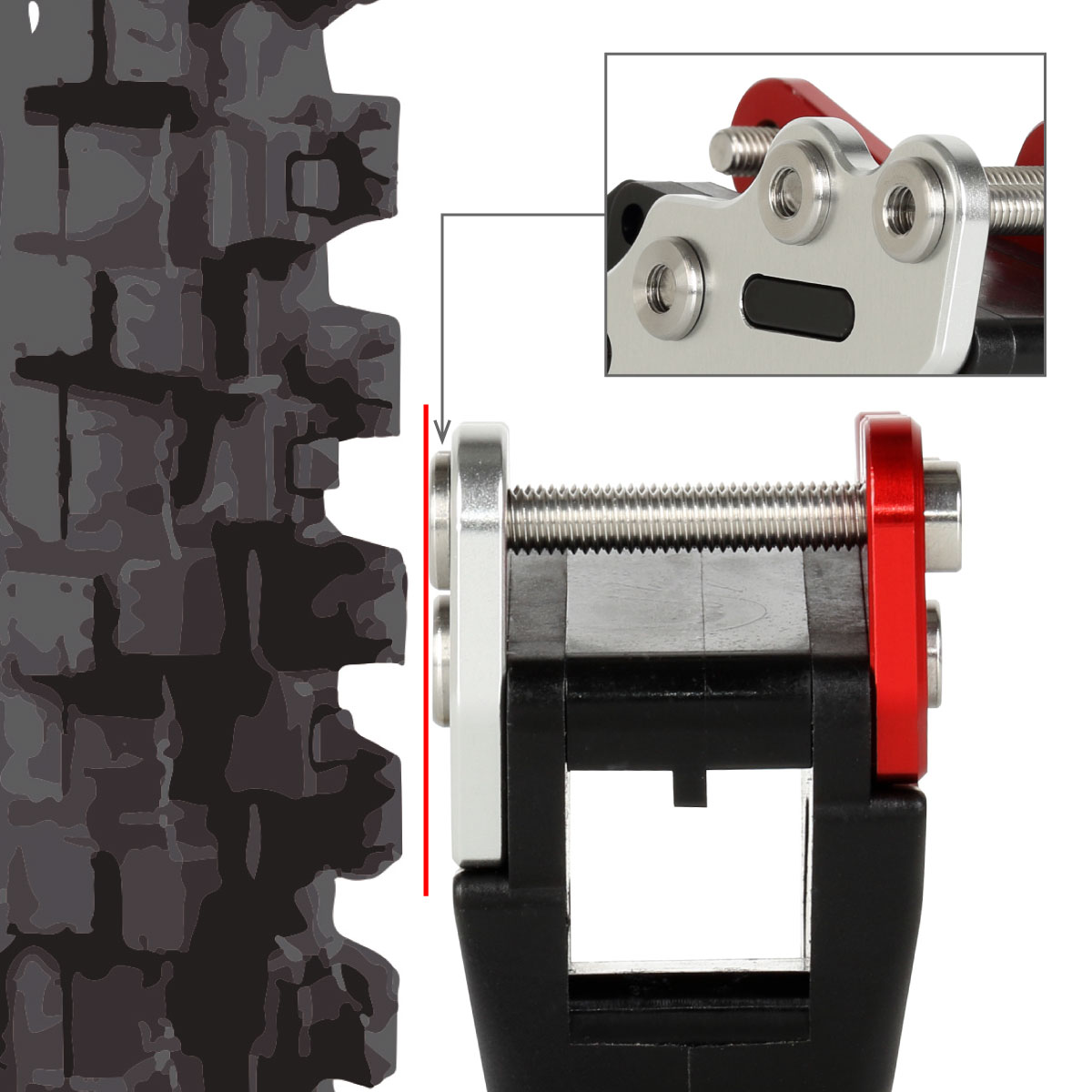ベースブラケットをスイングアームに溶接することで、固定強度を大幅に上げることができる。溶接できる範囲を広く取り、強い力を受けられるように設計。ボルトで取付け位置を固定できるため、溶接性に優れる。ハードなエンデューロなどにおススメ。