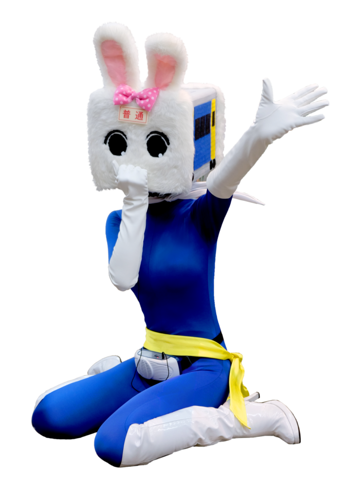 頭には兎の耳が付いた JR 東日本キハ E200 形気動車の形をした被り物を装着し、それより下が全体が青いタイツで覆われた容姿を持つ