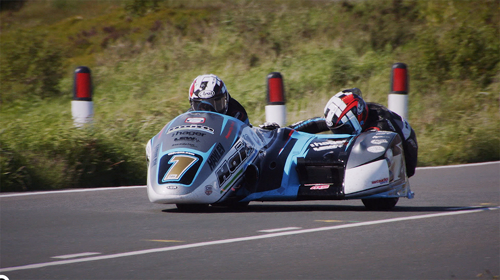 マン島の初夏を背景に山を駆け上がり、時にはテール・トゥ・ノーズで競い合う。