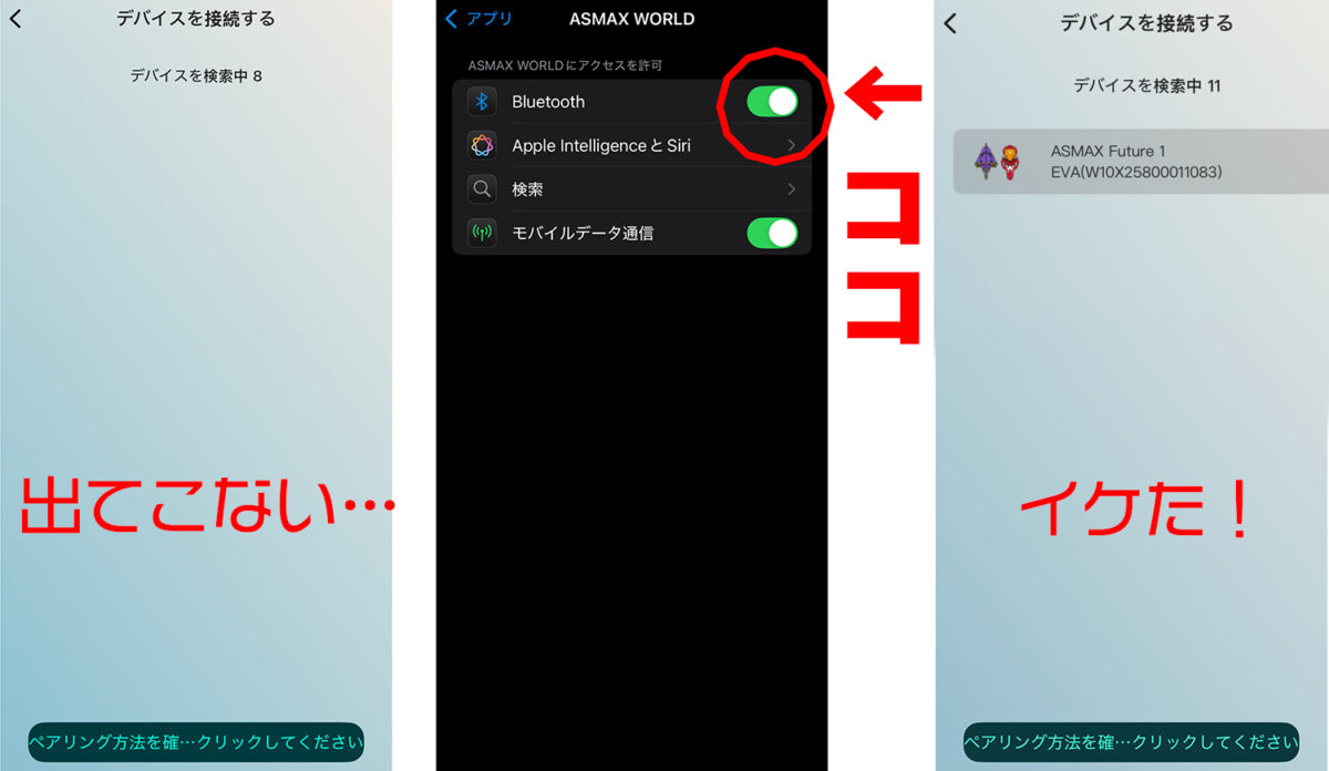 そんな時はiPhoneの「設定」から「アプリ」に行き、「ASMAX World」を選んだら「Bluetooth」をオンにしよう。これで問題なく接続できるようになる。