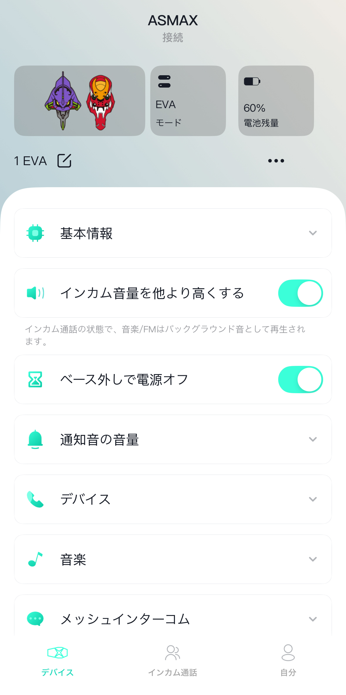 専用アプリ「ASMAX World」内で、デバイス接続などで表示されるアイコンはもちろんEVA。