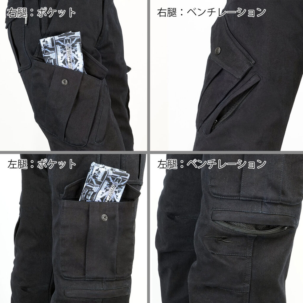 ウインドガードを採用することで走行風を遮断してくれるカーゴスタイルパンツ。「春のツーリングにそこまでの防風機能は不要では…?」と思うかもしれないが、ムレを防ぐ透湿素材を採用し、さらにベンチレーション機能まで装備するなど、汗ばむ時期も柔軟に対応してくれる機能を備えている。