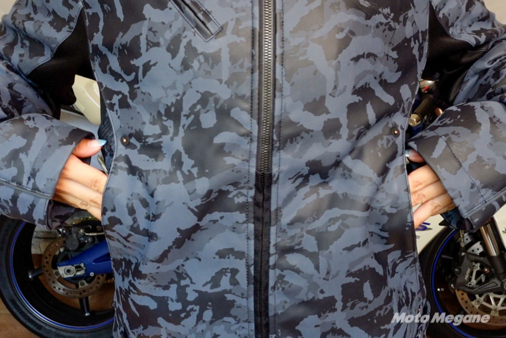 珍しい青色のカモフラ模様がカッコよくて気になりました。表面が防風性のがある丈夫な合成皮革で内側には保温性に優れた起毛素材を裏地に使用した二層構造となっています。