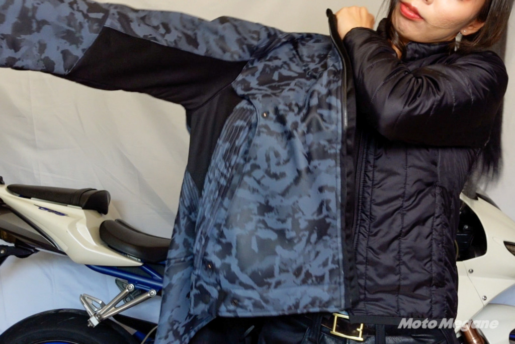 フロントチャック部分は雨で浸透しにくいように、マジックテープ・チャックの2層構造になっています。