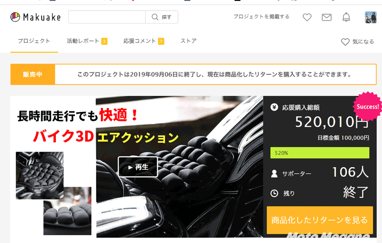 先日クラウドファンディングサイトを見ていた際にバイク3Dエアクッションなる製品を発見した。初見である。