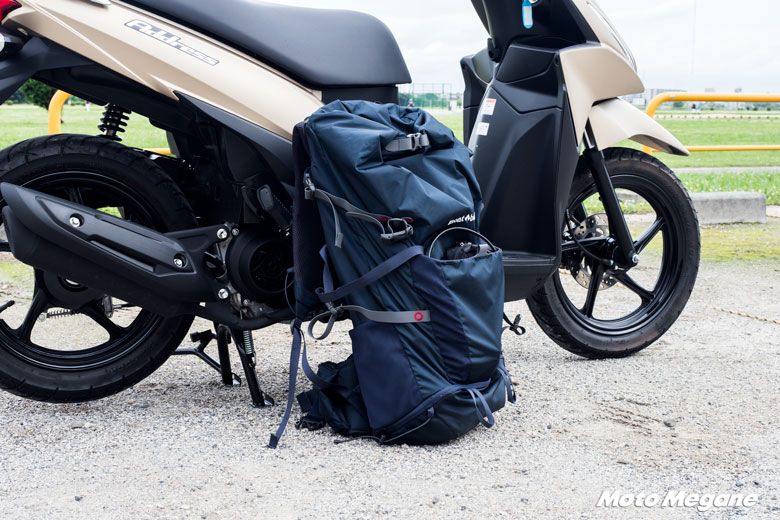 色々なバイクのロケにキトラパック35Lを背負って行きましたが、前傾がきついスーパースポーツバイクだと、顎を極端に上げる姿勢になるので、荷室がヘルメットに当たることがありました。