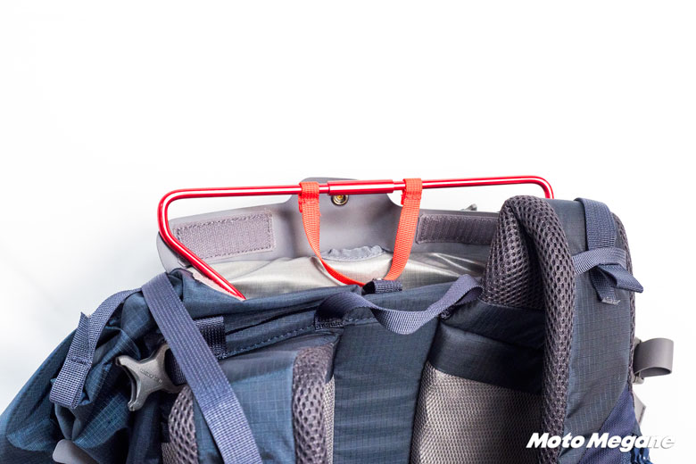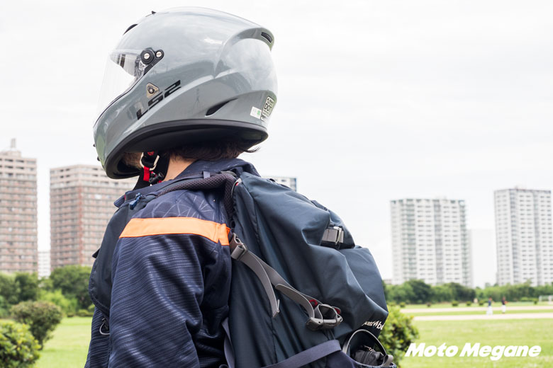 荷室が肩より上になってしまうと、ヘルメットを被ったときに後頭部がリュックに当たってしまいポジションが自由にならないことがあるので、調整しておきたいところです。