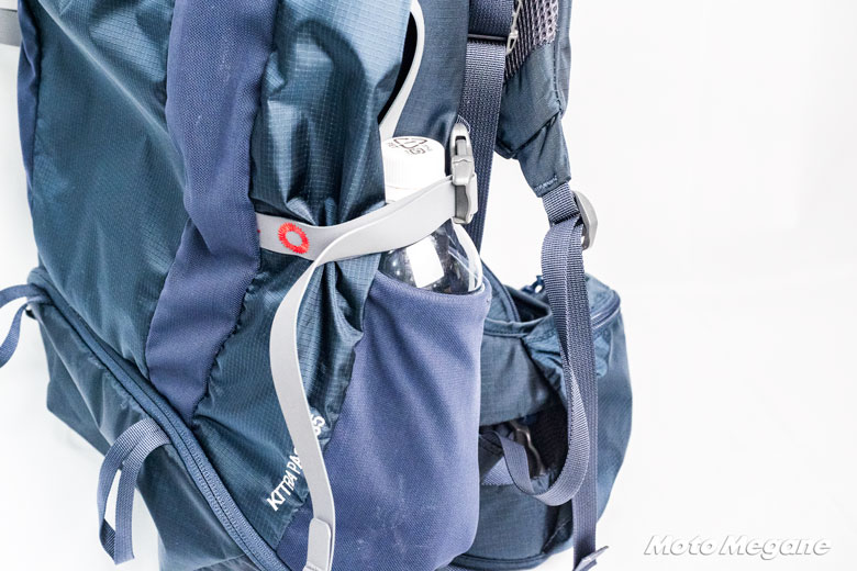ショルダーストラップの収納も見た目に反して大容量です。入れたことがありませんが、600mlのペットボトルまで入れることができるのだとか。ゴムでボトルを抑えるボトルストッパーもついているので、簡単には落下することはなさそうです。