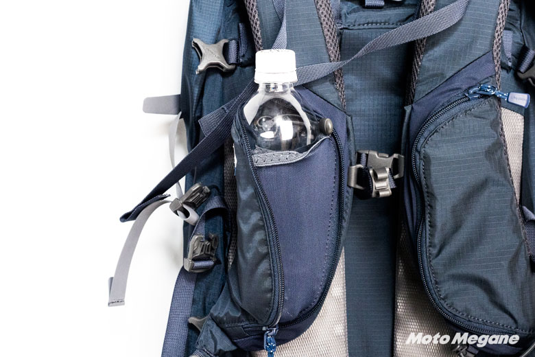 左右に設けられたワンドポケットにはペットボトルや三脚を入れておくことが可能で、走行中に落下しないようにコンプレッションベルトで固定も可能です。