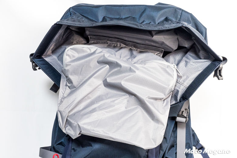 またバッグ内側にはウレタンコーティングされ防水性に優れたアクアバリアサックがマジックテープで固定され、バッグ上部のロールトップ構造と組み合わせることで防水性を確保しています。