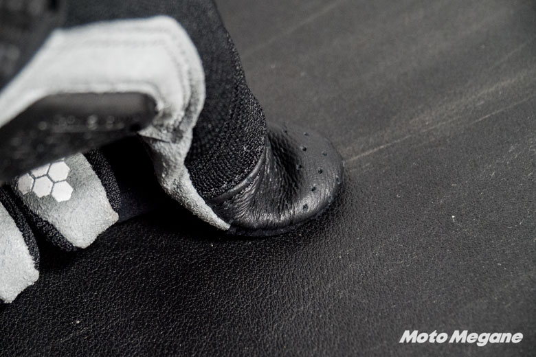 指先には引き裂き強度に優れた山羊革と4ウェイストレッチメッシュを採用。樹脂製のプロテクターも配している。