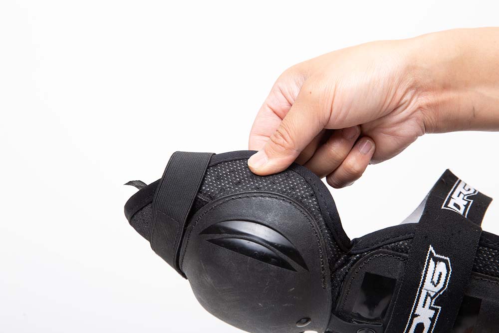 ストラップは全てベルクロ仕様。ニーシンガードというとストラップが2つのみのものが多く見られますが、同製品は膝上にもストラップがついているため、膝を曲げてもニーカップが浮いたり、ずれたりすることがありません。実際に曲げてみると、ずれることなくぴったり膝を覆っています。膝部分はライディングで激しく動かす部分のため、少しずれただけでも不快に感じることが多いですが、これなら気にせずライディングに集中できそうです。