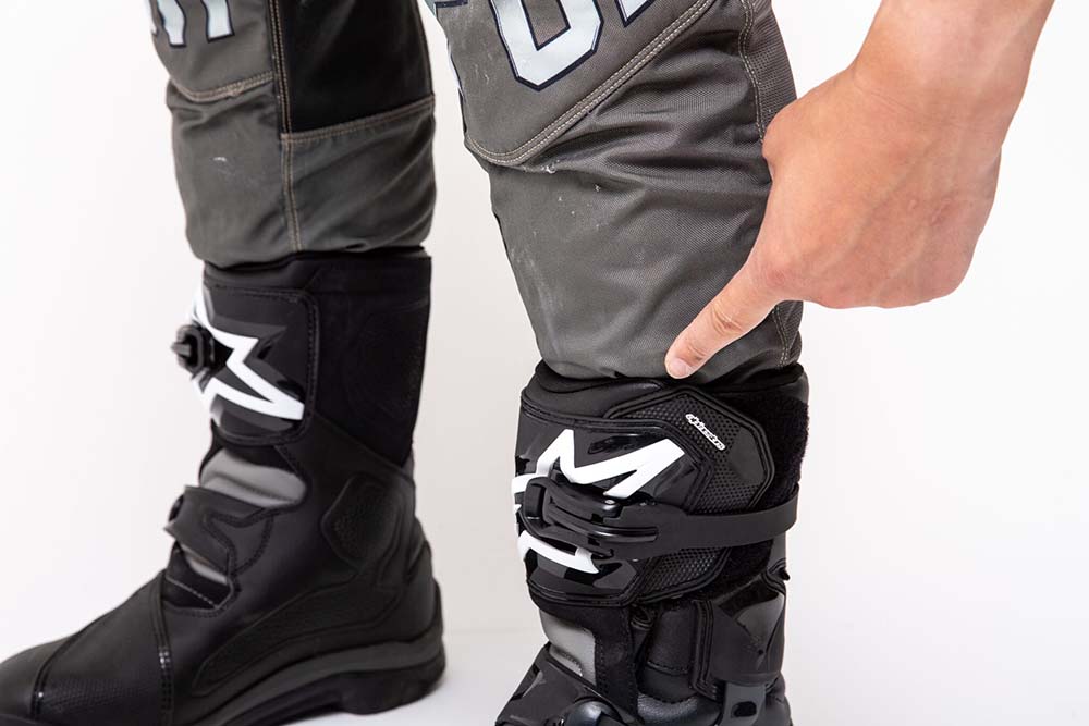 ちょうどニーシンガードの最下部の下にブーツがくるサイズ感。ずれ落ちることなく、着用できることがわかりました。ぜひ林道ライダーにもおすすめしたい!