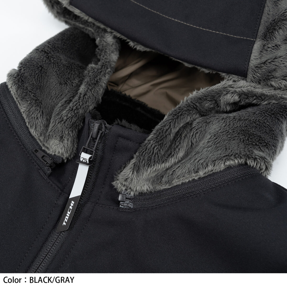 保温性に優れ、着心地のやわらかさが特徴的なフリースタイプの電熱インナーパーカ。休憩時、ライディングジャケットを脱いだ後も普段着のような感覚でカジュアルに着こなせる。カーボンファイバー発熱ユニットは、バイクの乗車姿勢において密着する両肩と背中に配置している。