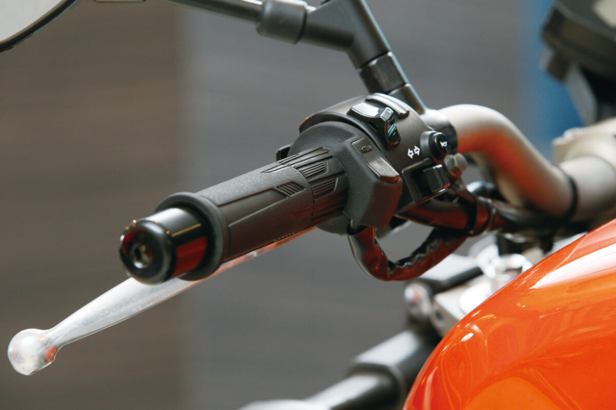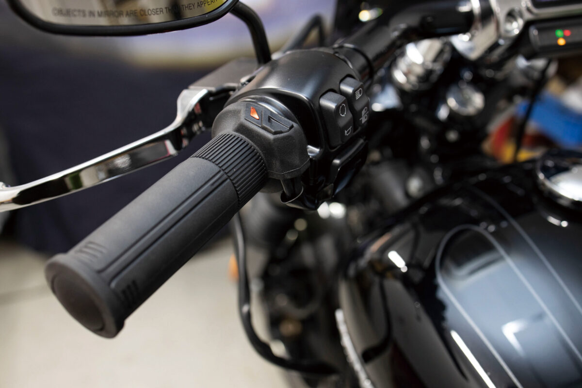 発熱温度を調節するコントローラーがスロットルパイプと一体になっているグリップヒーターだ。ヒーターはグリップの全周に巻かれており、5段階の温度調節ができるほか、現在の温度レベルがLEDインジケーターで確認できるので快適。グリップの径は多くのバイクで採用されているφ32㎜なので純正グリップと同じ操作感で握ることができ、違和感なく使えるのもありがたい。