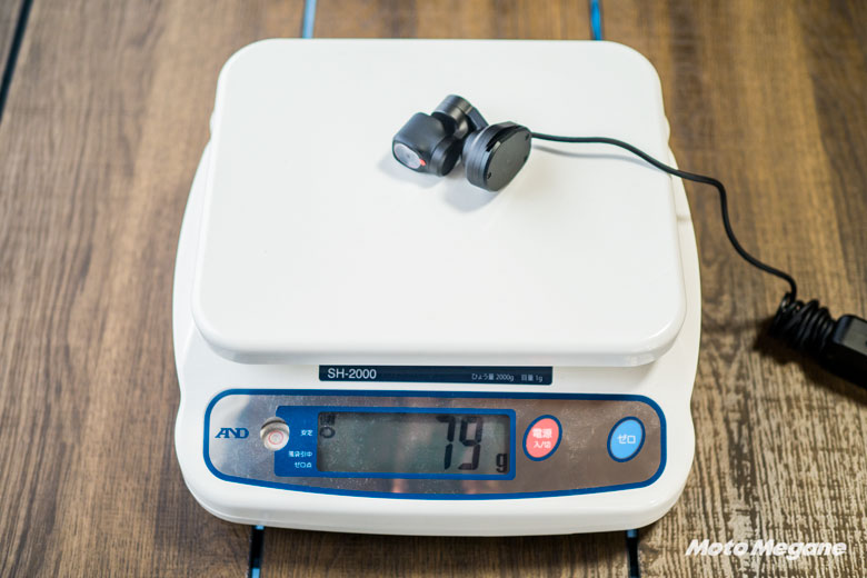 カメラ部分の重さは実測値で79gだった。Go Pro HERO9の重量が158gであることを考えればかなり軽量でヘルメットマウント時には首や肩などの負担を軽減できそうだ。