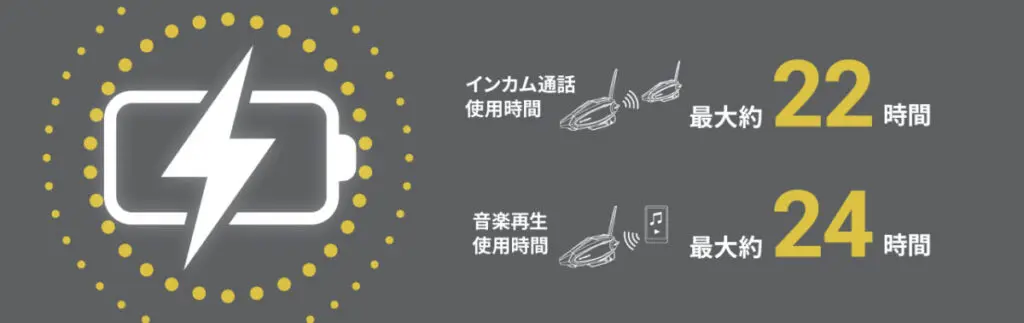 電気回路設計を最適化し効率の良いパワーマネジメントを組み込んだことで、インカム通話時間は最大22時間、音楽再生は最大24時間と1泊ツーリングなら宿で充電を忘れたとしても、翌日も安心して使えるバッテリー容量となっている。