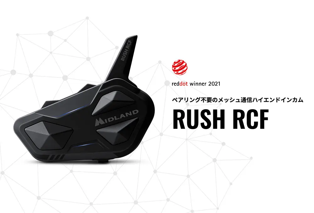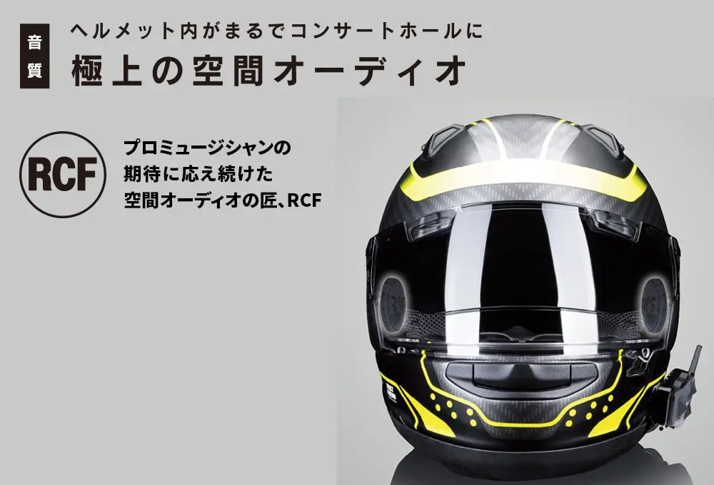MIDLANDのメッシュ通信対応インカム最新モデルRUSH RCFは、音響空間のスペシャリストRCF社監修によるRCFスピーカーを搭載することで、極上の空間オーディオを実現していることが特徴。