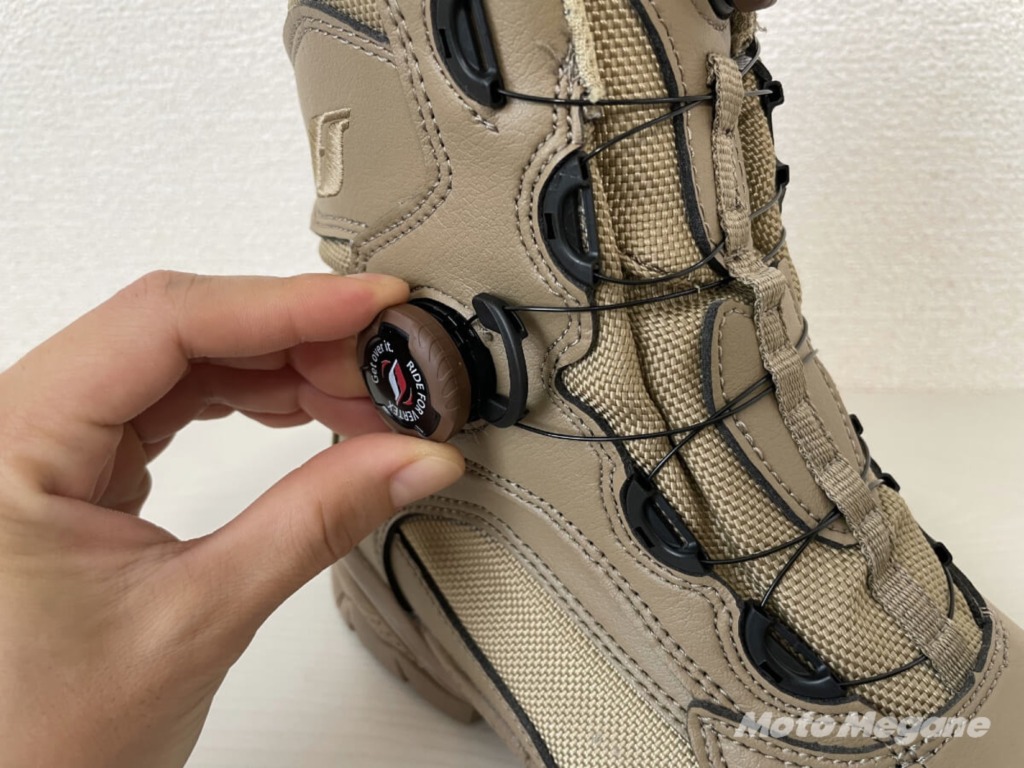 このタクティカルライディングブーツを縛るのは紐ではなく、ワイヤーを使ったSPINONシステムです。