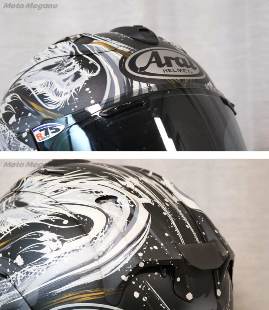 アライヘルメットの技術を集約した至高のフラッグシップモデル、RX-7X。その性能は折り紙つきで、レースシーンでも世界的に絶大な支持を集めるモデルであることに加えて、選手が実際にレースで使っているグラフィックが施されたレプリカモデルがラインナップされているのも大きな特徴。私のRX-7Xも全日本ロードレースや今年も開催間近となった鈴鹿8時間耐久レースなど、幅広い活躍で知られる清成龍一選手のレプリカモデルになっていて、大胆にレイアウトされた龍のグラフィックがとってもお気に入り!