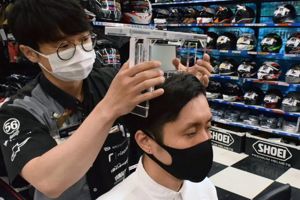 ライコランドTOKYOBAY東雲店のスタッフであり、SHOEIテクニカルショップ・アドバイザリースタッフの資格を有するチェさんに、実際に計ってもらいました。