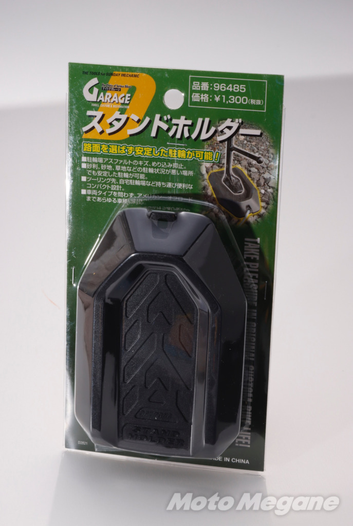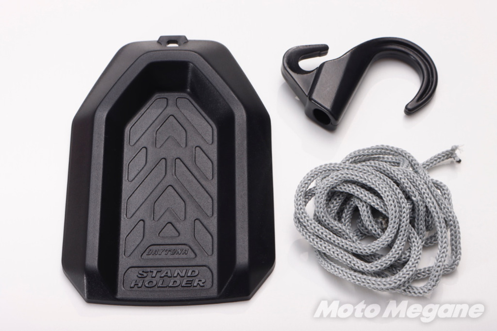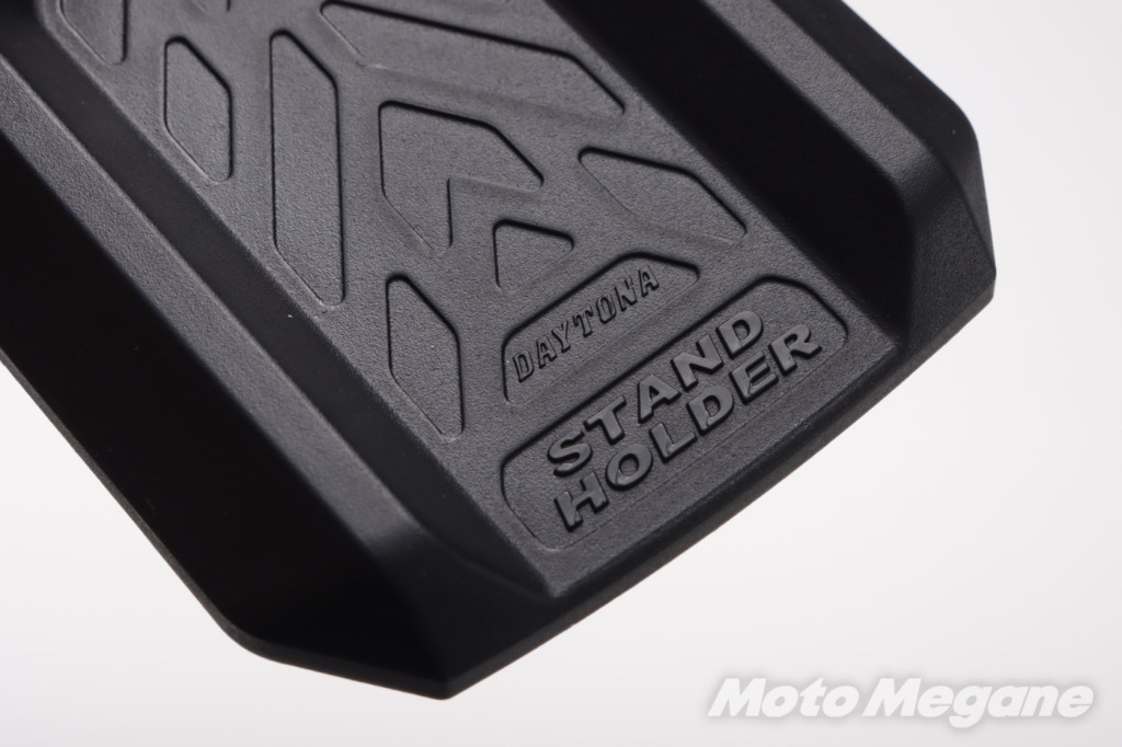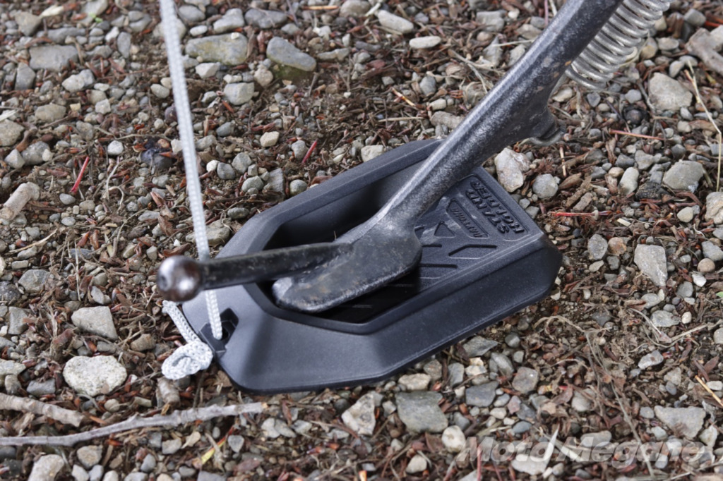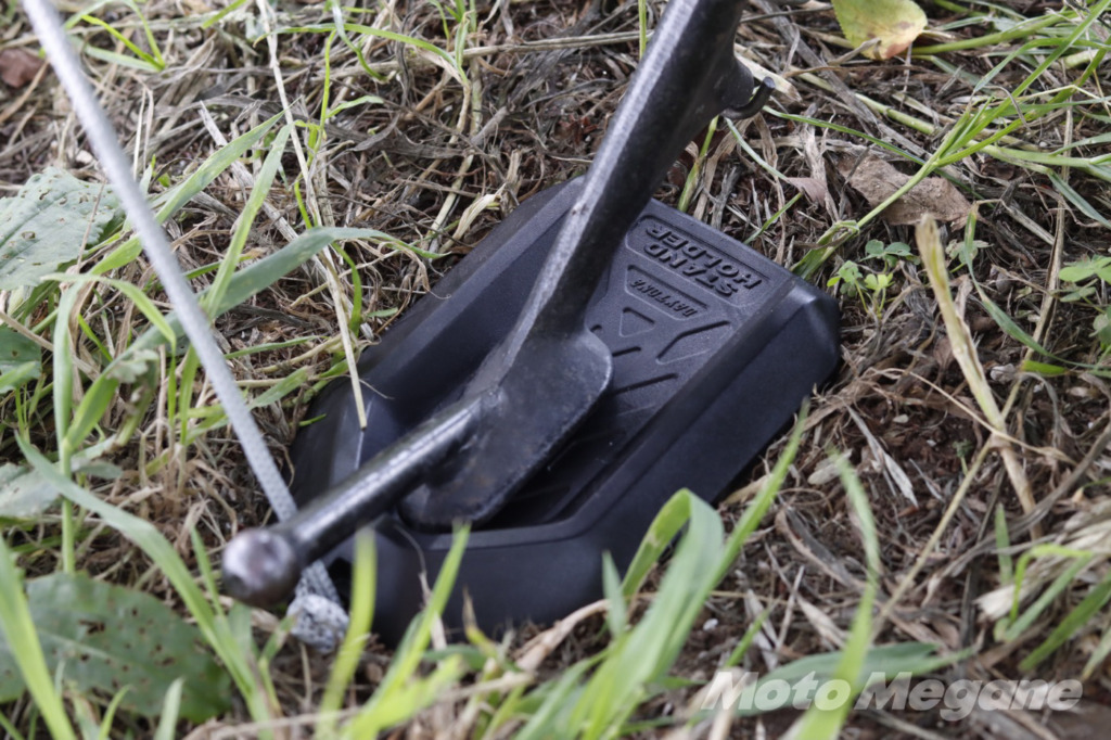 サイドスタンドの下に敷くことで不整地駐車での安定性を果たす、スタンドホルダーも適度なサイズ感で、サイドスタンドのめり込みを防ぐと共に持ち運びにも便利である。一回使ってみれば、簡単に見つかるはずもないちょうど良い石より断然専用品だと理解できるはずだ。
